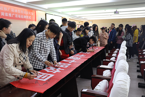 会上,禹明华对第一届“书香商务,浸润心灵”阅读推广活动进行总结并宣读表彰通报。她指出,我校对阅读推广工作十分重视,并打算深入开展阅读活动,培养同学们良好的读书习惯,在全校形成人人喜欢读书的良好风气。紧接着,对学校开展的“书香团支部”“阅读之星”评选活动获奖集体与个人进行表彰。