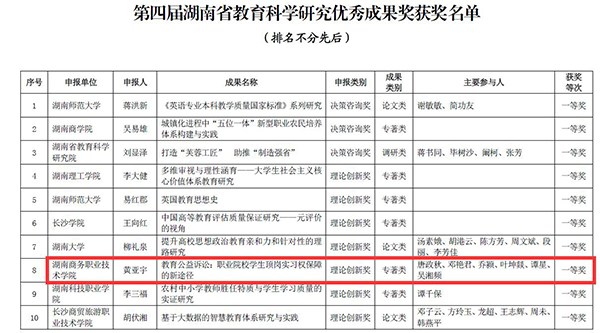 本网讯 (王振亚)日前,湖南省教育厅下发通知公布第四届湖南省教育科学研究优秀成果奖获名单,我校青年教师黄亚宇等榜上有名。黄亚宇团队的专著《教育公益诉讼:职业院校学生顶岗实习权保障》荣获一等奖。