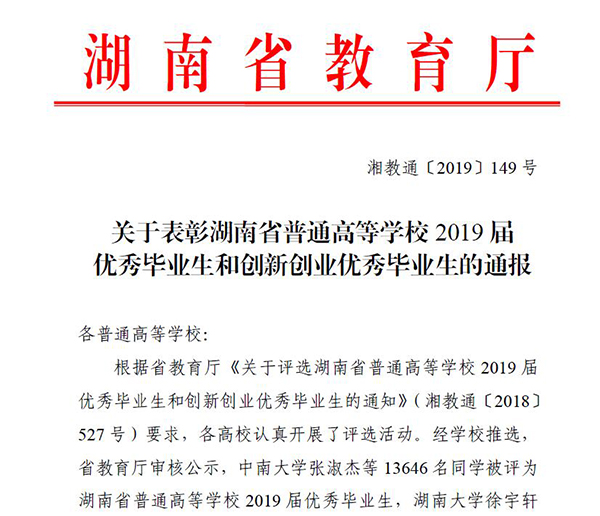 经学校推选,省教育厅审核公示,全省共有13646 名同学获评“湖南省普通高等学校2019 届优秀毕业生”,921 名同学获评“湖南省普通高等学校2019 届创新创业优秀毕业生”。两类荣誉中,我校获奖学生数在同类高校中居于领先地位。