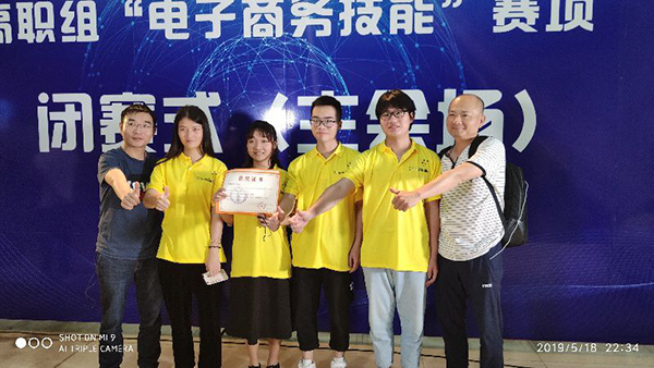 本网讯 (刘明浩) 5月18日,2019年全国职业院校技能大赛高职组电子商务技能比赛在山东济南工程职业技术学院成功举办,来自全国34个省、自治区、直辖市的87支代表队共348名选手参赛。我校由刘明浩、章明两位老师指导,来自17电商2班吴贤义、18电商2班王预华、17电商4班邓媚、17电商1班李佳薇组成的代表队荣获三等奖。