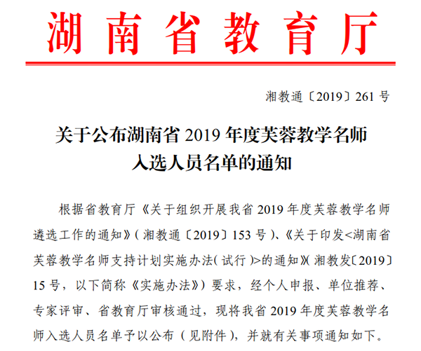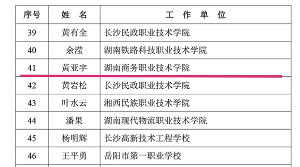 本网讯 近日,湖南省教育厅发布了《关于公布湖南省 2019 年度芙蓉教学名师入选人员名单的通知》(湘教通〔2019〕261号),经个人申报、单位推荐、专家评审、省教育厅审核通过,我校黄亚宇教授入选湖南省 2019 年度芙蓉教学名师,聘期自2019年9月算起,支持周期为3年。据悉,此次全省共评选出99名芙蓉教学名师,其中高职院校仅有15人入选,这是对我校近年来积极开展人才培养工作的充分肯定。