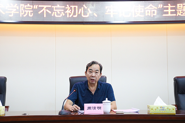 ▲我校党委书记周忠新围绕开展好学校主题教育发表重要讲话。