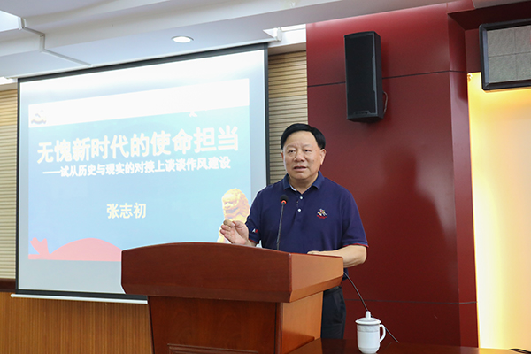 本网讯(记者杨路平 胡星 刘佳蕊)9月28日下午,我校在办公楼六楼学术报告厅举行“不忘初心、牢记使命”主题教育集中学习专题讲座。湖南省政府参事张志初受邀来我校开展题为《无愧新时代的使命担当》专题讲座。校党委书记周忠新、校长李定珍等班子成员出席讲座,全体在职教职工党员、非党员中层以上干部、学生党员代表、离退休党员代表参加讲座。