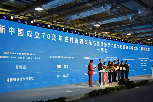 ▲活动现场为42名获得“新中国成立70周年农村流通改革与发展暨第二届乡村振兴高峰论坛”优秀论文的个人颁发奖项。