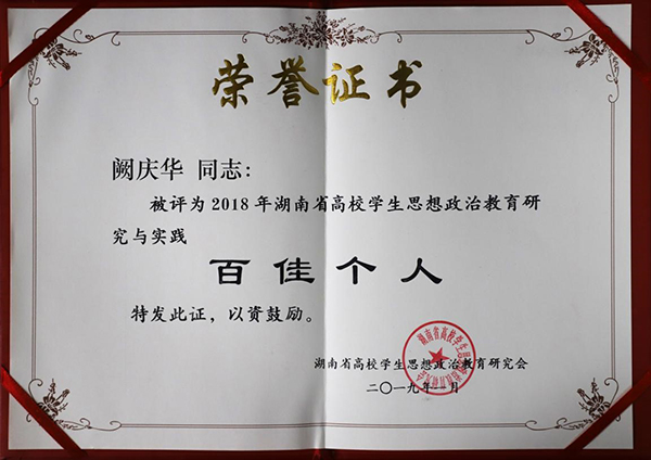 近日,从湖南省高校辅导员工作研究会得知,经湖南省高校学生思想政治教育研究会、湖南省辅导员工作研究会考核评审,我校荣获“湖南省高等学校辅导员工作研究与实践先进单位”;冯湘荣获“湖南省高校辅导员工作研究与实践百佳个人”;阙庆华荣获“湖南省高校学生思想政治教育研究与实践百佳个人”。