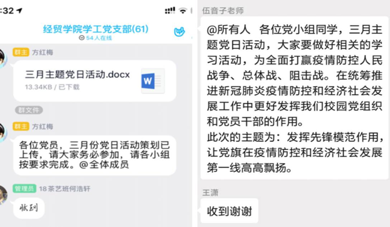3月7日下午,经济贸易学院学工党支部全体党员以小组为单位在线上开展“发挥先锋模范作用”“云”主题党日活动。本次活动共分为8个党小组,17级毕业生党员在工作之余也积极参与。
