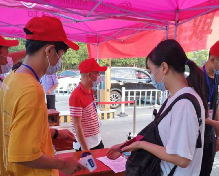 在学院校门口,考生全程佩戴口罩,自觉排队接受体温检测。在出示健康码和通信数据行程卡后,才能进入楼栋和考室。对于现场首次测温出现异常的考生,学院配备了2名专业医生值守,负责复测和按相关程序进行处置。