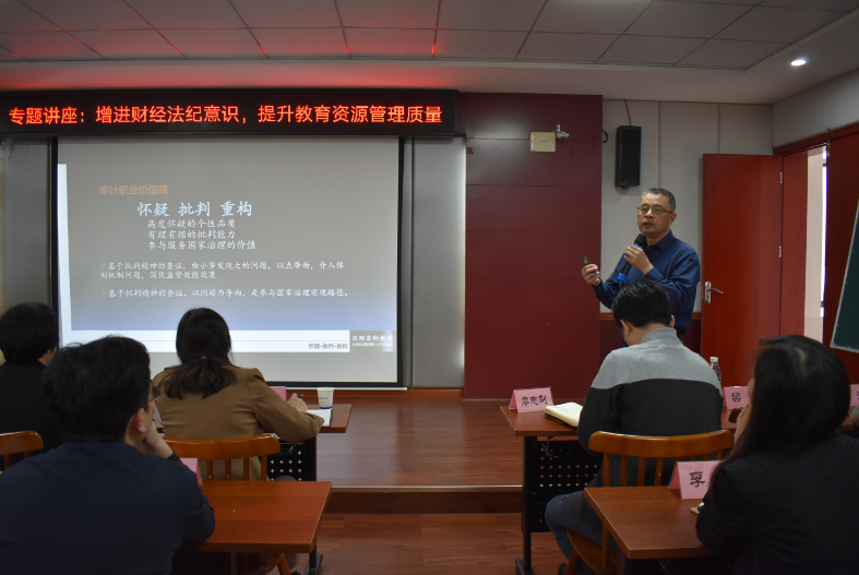 第一讲由湖南省审计厅审计处教授、一级调研员、湖南大学的特聘教授、湖南科技大学硕士研究生导师陈刚主讲。陈刚从审计新样貌、内部控制制度及应用、教育资源管理存在问题、警钟长鸣自省自律四方面,联系学院实际进行系统讲解,指出高校教育资源属于人民所有、学生是我们全心全意的服务对象,要求学院基建、后勤管理、资产管理、图书采购等工作要防微杜渐、及时发现和整改问题,堵住管理中的漏洞,让每一份办学成本都发挥最大效用。