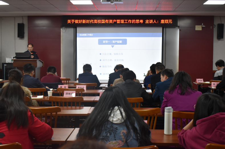 第二讲由审计厅唐顺元处长主讲,他以“关于做好新时代高校国有资产管理工作的思考”为题,提出高校资产管理要坚持目标导向、坚持问题导向、坚持成绩导向,要以中央和省委对国有资产管理提出的新要求为遵循、破除高校对国有资产管理认识存在的误区,强调资产清查工作的重要性。