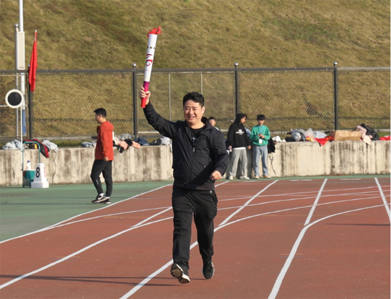 紧接着,本次运动会最令人期待 “携手奋进、共创一流”火炬接力仪式正式开始。接力仪式由学院领导、教师代表和学生代表采取跑步传递接力的方式共同完成,共十五个接力点,全程八百米,由党委书记周忠新、院长李定珍、党委副书记廖志刚、副院长廖良林、纪委书记姜华斌、副院长禹明华、副院长易兰华、党委委员聂振华、刘谦、皮卫,学生代表李木剑、青年骨干教师杨小燕、基础课部教师周妮、保卫处处长周旭、会计学院博士李志军共同接力。每一位火炬手高举火炬,将象征着学院70年来的办学积淀与荣誉的火炬以铿锵坚定的步伐传递下去,熊熊燃烧的火炬也寄托着全院师生对于学院美好未来的期望。当李志军在全场的瞩目下接过最后一棒,登上主席台高举火炬之时,点燃了全场运动热情,达到了活动高潮。