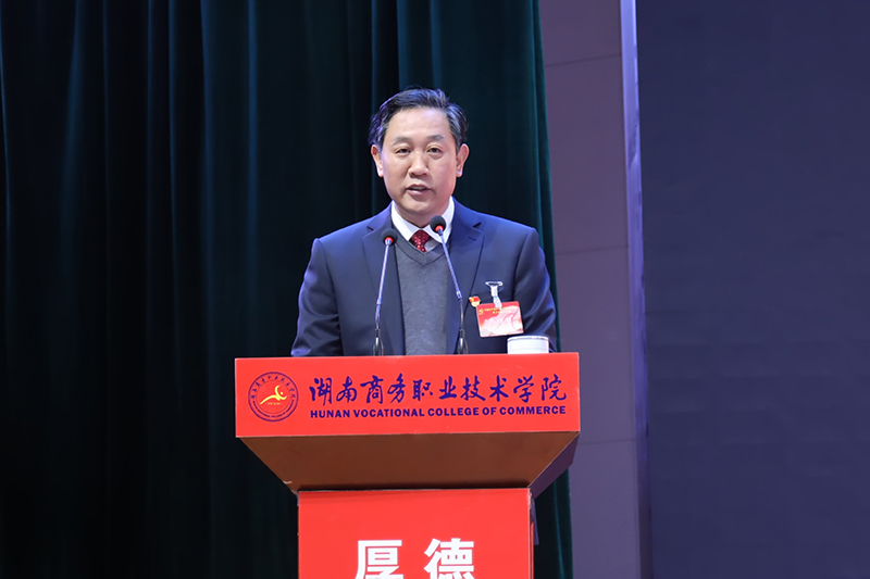 会议伊始,党委书记周忠新代表大会主席团,向长期以来关心支持学院建设和发展的各级领导、兄弟院校、各界朋友和广大校友,向学院的老领导、离退休老同志、各民主党派和党外人士,向辛勤工作在教学、科研、管理、服务第一线的共产党员和师生员工,致以诚挚的感谢。随后,周忠新代表中共湖南商务职业技术学院第二届委员会,以《立德树人 强商惠农 为建设中国特色高水平高职院校努力奋斗》为题,向大会作报告。报告回顾和总结了学院第二次党代会以来取得的各项成绩和宝贵经验。周忠新指出,七年来,在省供销合作总社、省教育厅的正确领导下,学院党委坚决贯彻党的教育方针,团结带领学院广大党员和师生员工,深入实施“人才强校、改革兴校、质量优校、开放办校、和谐筑校”发展战略,党的建设和综合实力达到新高度,各项事业发展站上新起点。特别是2018年立项“湖南省卓越高职院校建设单位”,学院正式迈进湖南省高职教育第一方阵,成功进入2015-2019年全国高职院校学科竞赛排名前100强,学院综合实力显著增强。经过七年的实践,党委领导核心作用充分彰显, 理论武装进一步强化, 顶层设计进一步优化, 治理体系进一步完善,教育教学改革有新突破, 人才培养水平有新高度, 师资队伍建设有新成绩,科学研究有新进展, 文化宣传有新亮点, 社会服务能力有新提升, 对外合作交流有新步伐,办学条件有新改善, 民生工程有新成效。思政工作、基层党建、干部队伍、党风廉政、统战工作、群团工作全面加强。