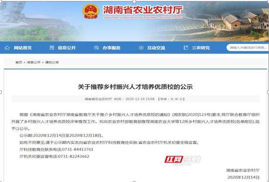 日前,从湖南省农业农村厅公示信息《乡村振兴人才培养优质校公示》获悉,包括湖南商务职业技术学院在内的12所学校,拟作为国家级乡村振兴人才培养优质校被推荐至农业农村部教育部。