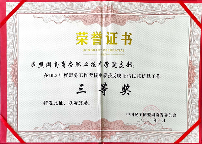 日前,从中国民主同盟湖南省委员会传来喜讯,民盟商务职院支部荣获“2020年度反映社情民意信息工作三等奖”。