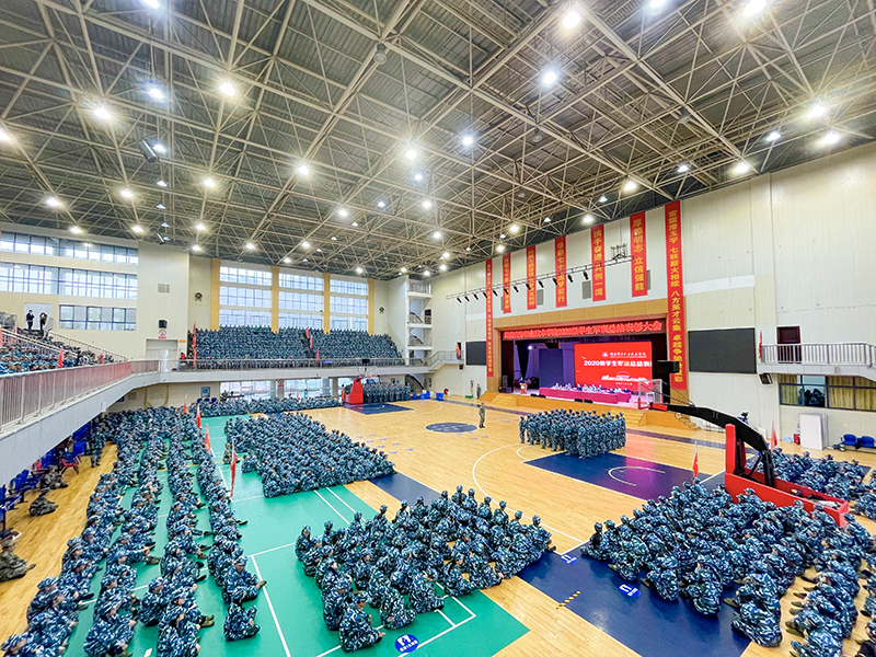 伴随着嘹亮的国歌声,军训团2020级学生军训汇报表演拉开帷幕,学生们以饱满的热情迎接检阅。接受检阅的连队精神饱满,队列整齐,军姿威严,嘹亮的口号响彻体育馆内。随后,由标兵和拳术连组成的方阵分别进行了分列式表演和军体拳表演。“立正!稍息!……军体拳准备!”整齐的队列、洋溢朝气的面庞、规范而又标准的动作,展示了我院学生良好的形象和精神风貌,精彩的表演赢得在场领导和师生的阵阵掌声。