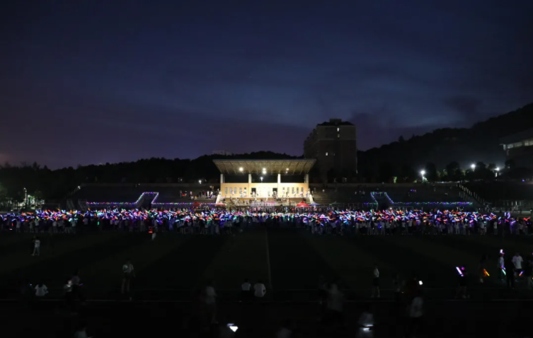 19时40分,千人方阵组合为“1921—2021”的图形,手握荧光棒,共同合唱《没有共产党就没有新中国》,以此来庆祝中国共产党诞辰一百周年。现场热闹非凡,千人齐声高歌,用自己的热情点燃了同学们的激情。
