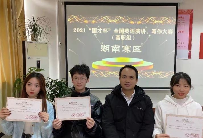 旅游管理学院肖杜鹃、谢增泓和电商学院肖雅静三位同学在吴玉光老师的指导下,分别参加英语演讲和写作两个项目的比赛。在演讲比赛中,经过一轮定题演讲、一轮即兴演讲及问答,肖杜鹃和肖雅静两位同学稳定发挥,以其庄谐相宜、富有感染力的精彩演讲,分别获得一等奖和三等奖。谢增泓同学参加写作赛项,快速高效完成比赛,最终荣获二等奖。