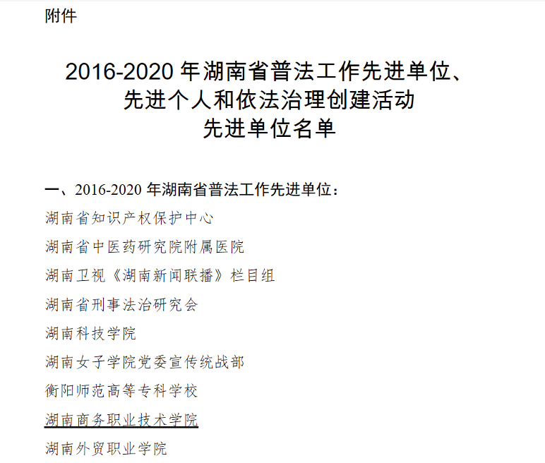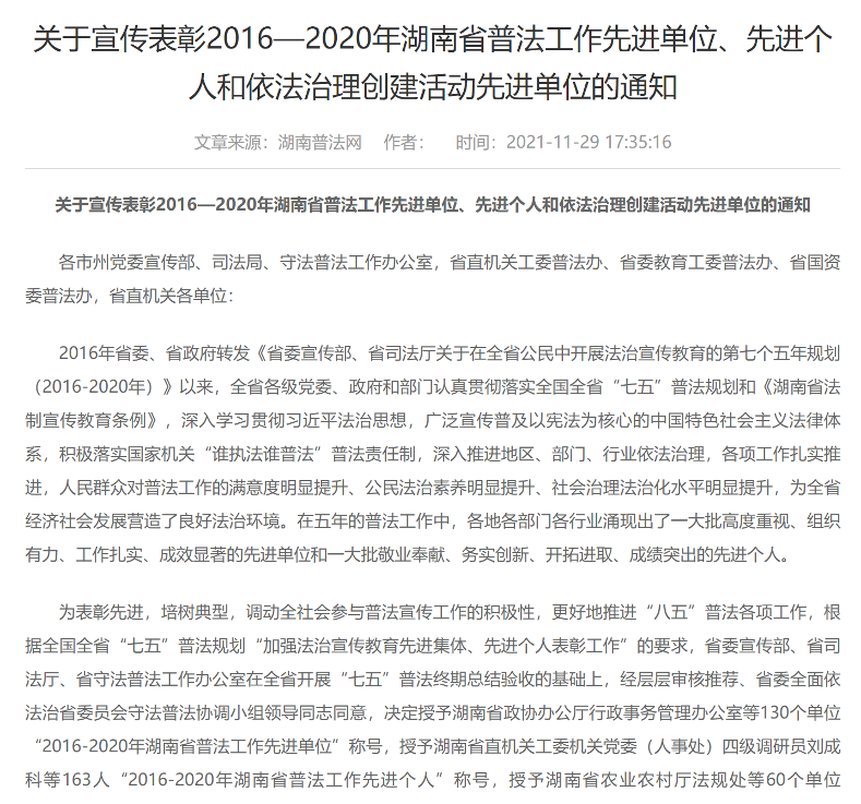 近日,中共湖南省委宣传部、湖南省司法厅、湖南省守法普法工作办公室联合下发《关于宣传表彰2016—2020年湖南省普法工作先进单位、先进个人和依法治理创建活动先进单位的通知》,我院获评全省“七五”普法工作先进单位。