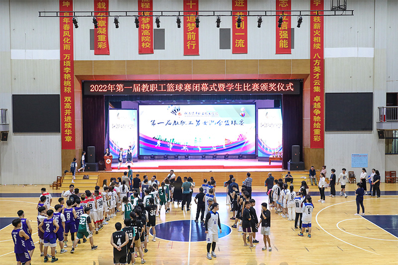 无私奉献育桃李,奋力拼搏展英姿。5月24日晚,湖南商务职业技术学院举行2022年第一届教职工男女混合篮球赛闭幕式暨学生比赛颁奖仪式。党委委员、纪委书记姜华斌,党委委员、副院长禹明华,党委委员刘谦以及各分工会教师代表、学生代表参加活动。