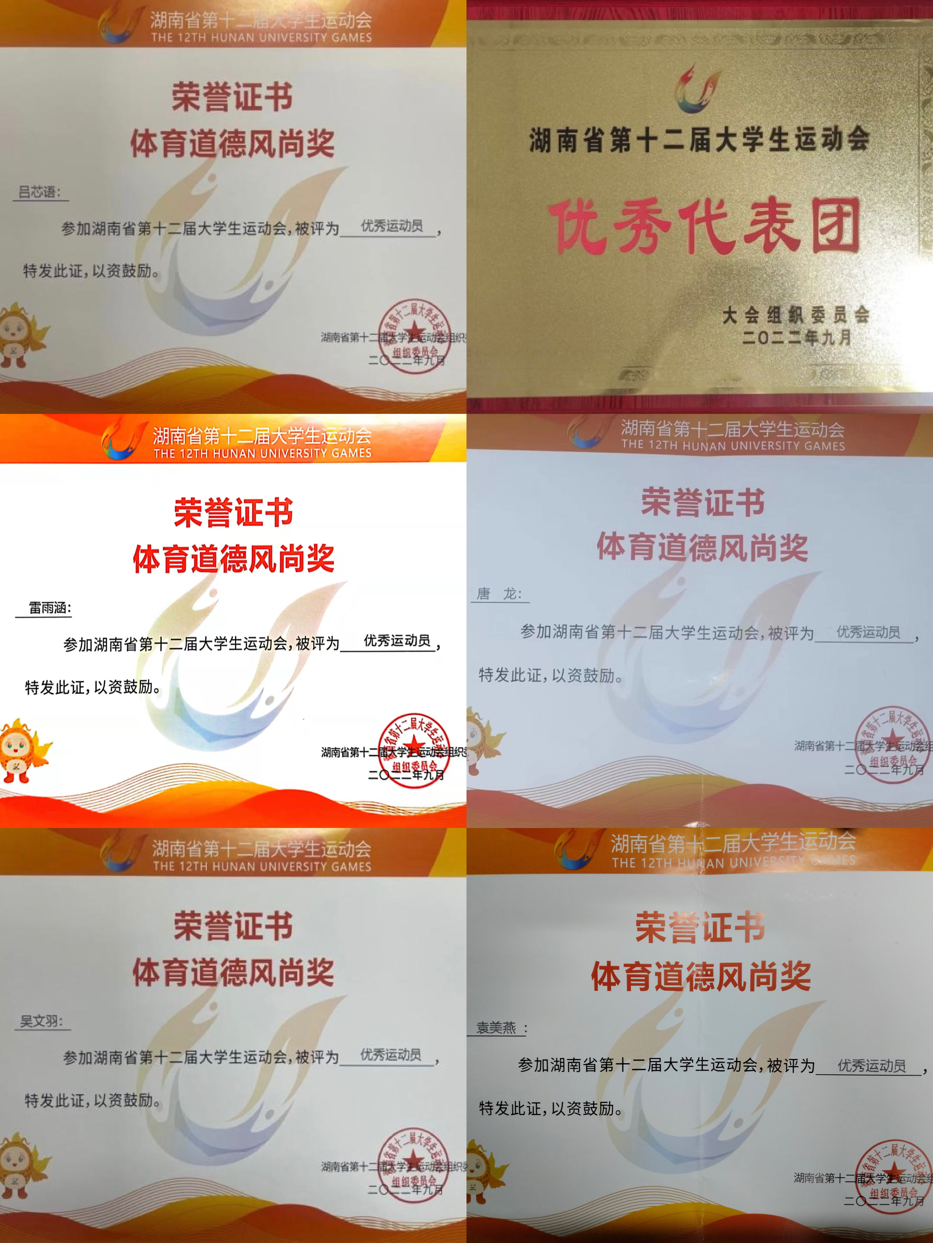 四年一届的省大学生运动会是湖南省规格最高、项目最全、参赛人数最多的综合性运动会,本次比赛共设田径、游泳、篮球、排球、足球、乒乓球、羽毛球、武术、跆拳道等11个项目,吸引了来自全省100多所校的10000多名运动员参赛,是历届以来参赛队伍最多、水平最高的一次比赛。湖南商务职院由体育课部部长崔宏超率队,派出了28名运动员参加了五个大项(田径、羽毛球、乒乓球、跆拳道和网球)的比赛。赛场上,运动员们奋勇拼搏,全力以赴,尽显运动魅力;赛场下,团结协助,勤奋训练,赢得了赛委会及兄弟院校的高度评价,获得了“优秀代表团”称号,袁美燕、吕芯语、吴文羽、雷雨涵、唐龙和陈微五位同学获得了“优秀运动员”荣誉称号,柳颉、刘香、王杰、崔宏超四位老师被授予“优秀教练员”荣誉称号,充分彰显了商务人的风采。