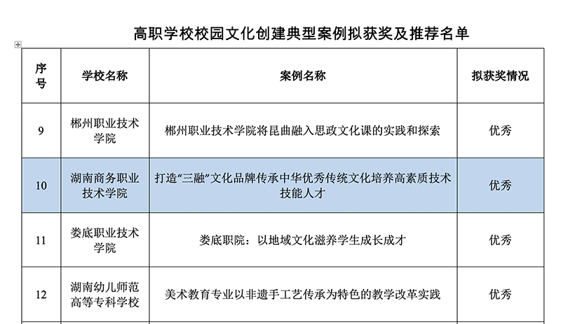 近日,根据湖南省教育厅、湖南省文化和旅游厅公布的《湖南省职业院校"技能传承中华优秀传统文化"展示活动第二批评审结果》,湖南商务职院“打造‘三融’文化品牌传承中华优秀传统文化培养高素质技术技能人才”获评优秀,这是既湘商文化院获评“湖南省优秀社科普及基地”后,学院校园文化建设工作获得的又一殊荣。