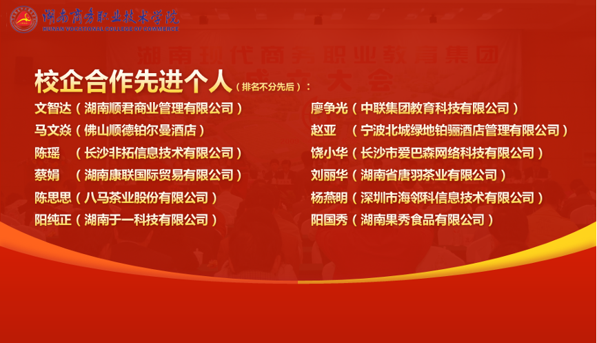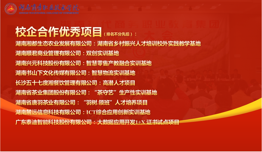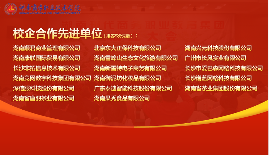 据悉,湖南现代商务职业教育集团于2009年4月由湖南商务职业技术学院牵头成立,现拥成员单位119家。13年来,集团坚持“人才共育,基地共建,过程共管,资源共享,责任共担”的原则,积极推动校企合作,共建湘茶现代产业学院和新一代信息产业学院,共建校内外实习实训基地300余个,共建专业42个,共同培育学徒制学生800余人、订单班学生2000余人,年开展农民工等社会培训达1.2万人次,校政协企行合作育人成效显著,先后被湖南省教育厅评为省级示范性职业教育集团和“楚怡”示范性职业教育集团。