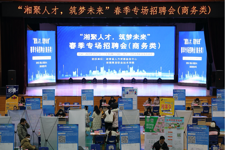 (通讯员 刘芳芳 杨馥榕 李卓)3月21日,春分时节,天气微冷,湖南商务职业技术学院体育馆热闹非凡——2023届毕业生常设市场春季校园招聘会在此举办。招聘会以“湘聚人才.筑梦未来”为主题,积极响应教育部“抢抓春招关键期 全力攻坚促就业”精神,由湖南省人力资源中心和学院联合举办。
