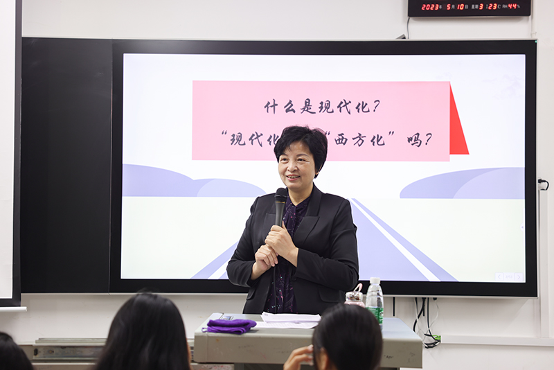 “什么是现代化?什么是中国式现代化?”课堂上,李定珍从接续奋斗,追求千年梦想;立足国情,开辟全新道路;凝心聚力,推进复兴伟业三个方面对中国式现代化进行了全面解读,详细介绍了新中国奋斗历程,揭示了中国式现代化的特色与本质要求。回顾百年党史,李定珍指出中国式现代化是中国共产党领导的社会主义现代化,既有各国现代化的共同特征,更有基于国情的中国特色,开创了不同于西方资本主义现代化的全新路径,打破了“现代化等于西方化”的迷思,为人类对更好社会制度的探索提供了中国方案、贡献了中国智慧。