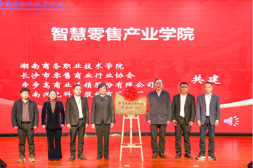会上举行了产业学院揭牌仪式。湖南商务职院与长沙市零售商业行业协会、步步高商业连锁股份有限公司、湖南兴元科技股份有限公司共建智慧零售产业学院,与用友网络科技股份有限公司、新道科技股份有限公司共建数智财务产业学院,共同探索校企“双主体育人”人才培养模式改革,培养创新型、复合型、高素质技术技能人才。