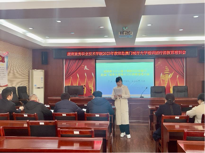 发展规划与合作交流处处长,本次学校教师赴澳门城市大学培训团团长唐柳荷组织团员学习了湖南省委外事办下发的《因公临时出国(境)行前教育参考资料》,并组织培训团团员签署了《湖南商务职业技术学院教师出国(境)承诺书》。(通讯员 彭心怡)