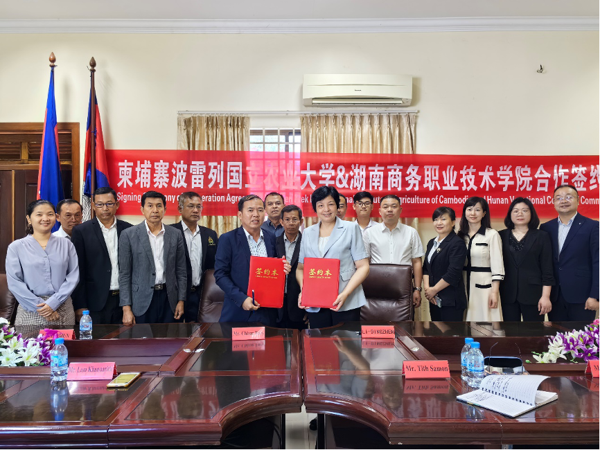 为创新职业教育国际交流与合作机制,坚持“教随产出、校企同行”和“走出去”“引进来”双线发展,2024年4月24日至30日,湖南商务职业技术学院携手湖南省茶业协会、湖南省茶业集团股份有限公司,在学院院长李定珍和协会会长、集团公司董事长周重旺为团长的带领下,校企同行,应邀出访了柬埔寨、泰国相关院校和企业,先后与柬埔寨健康农业公司、柬埔寨波雷列国立农业大学和泰国格乐大学签订了战略合作协议,拜访了中华人民共和国驻柬埔寨王国大使馆经济商务处,参加了第十届尼山世界文明论坛泰国分论坛暨中泰教育合作文化交流峰会,参观访问了泰国中国国际学校。