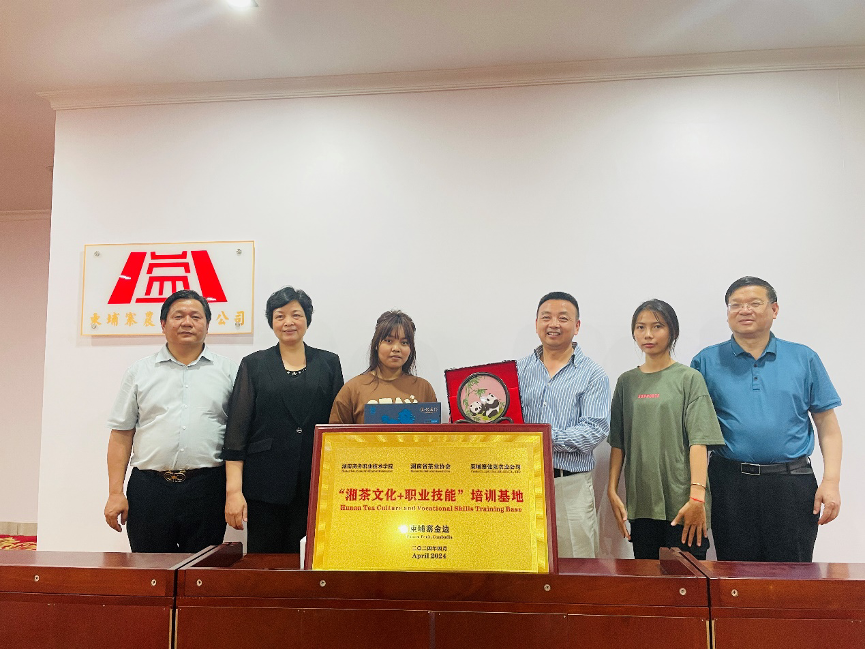 在柬埔寨健康农业有限公司,代表团考察公司生产、种植基地,举行校-行-企合作座谈会,研讨了校行企跨国深度合作、联合培养人才的实质运作有关问题,签署了“共建湘茶产业联盟战略合作框架协议”,就共建海外(柬埔寨)技术技能人才培养基地,开展“中文+茶苗繁育、茶园(种植)管理、茶叶加工、茶叶精制(拼配)、茶艺、评茶、茶文化推广、茶品牌策划与营销”等涉茶职业技能培训,打造五彩湘茶海外营销窗口等方面达成共识,并举行了“‘湘茶文化+职业技能’培训基地”揭牌仪式。