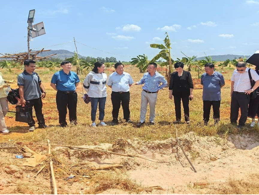 访问团来到柬埔寨健康农业公司基地进行实地考察。公司董事长刘海龙对公司情况做了介绍:柬埔寨健康农业公司是一家在柬埔寨注册、成立于2015年的中资企业,在离金边约140公里的柏威夏省自购有1000多公顷农田,主要种植柬埔寨茉莉香米水稻、香蕉、榴莲等农产品,农产品出要出口至中国,一方面为国家的粮食安全奉献力量,另一方面也致力提高当地农户的农业种植技术水平,促进中柬两国发展关系。李定珍、周重旺带领学校、企业两队出访团成员深入农间地头,考察柬埔寨健康农业公司基地的土壤、当地的气候环境,与刘海龙探讨在基地引入湘茶幼苗种植的可能性。