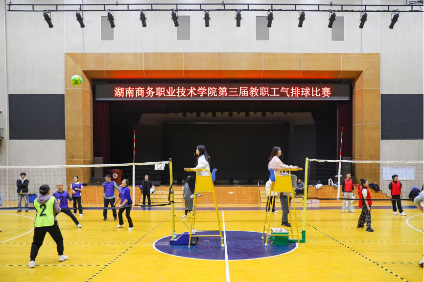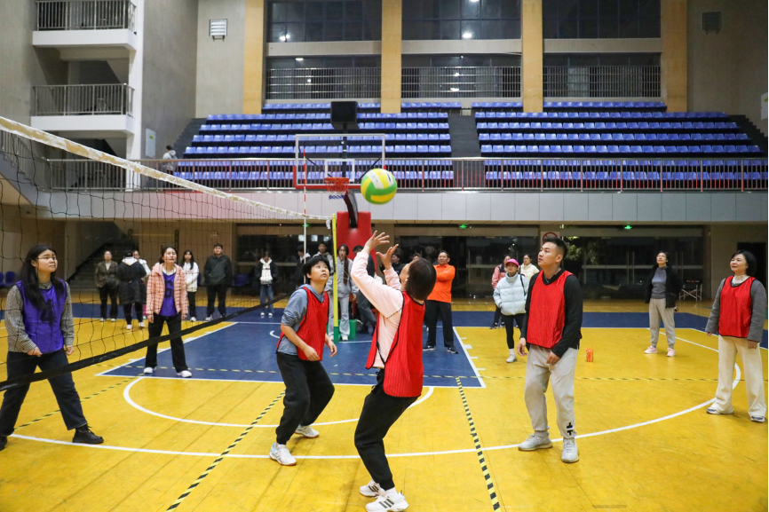 虽处寒冬,但体育馆内的比赛现场,气氛炽热而紧张。双方球员全神贯注,每一个动作都充满力量与决心。传球的瞬间,队员们之间的默契尽显,球在他们之间快速而精准的传递。男教职工们凭借力量与速度的双重优势,屡屡上演精彩扣杀;而女教职工们则以灵活多变的战术和细腻的球技,为队伍赢得了宝贵的分数。每一次比分的交替上升都牵动着观众们的心,他们为自己支持的队伍欢呼雀跃,也为每一个精彩的瞬间鼓掌喝彩。男女混搭的参赛形式更是增添了比赛的趣味性和观赏性,让赛场上的每一次进攻与防守都充满了悬念与惊喜。