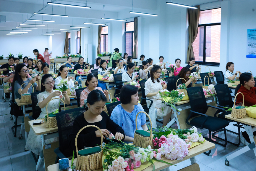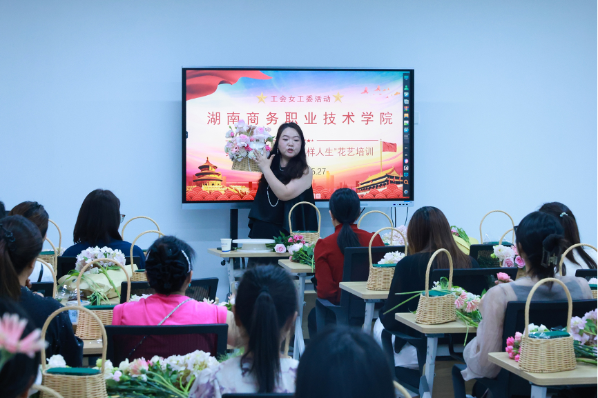 为了丰富校园文化建设,丰富女职工精神生活。湖南商务职业技术学院工会女工委于2025年5月27日在崇理楼开展了第五期“花香花语,花样人生”插花花艺培训活动。