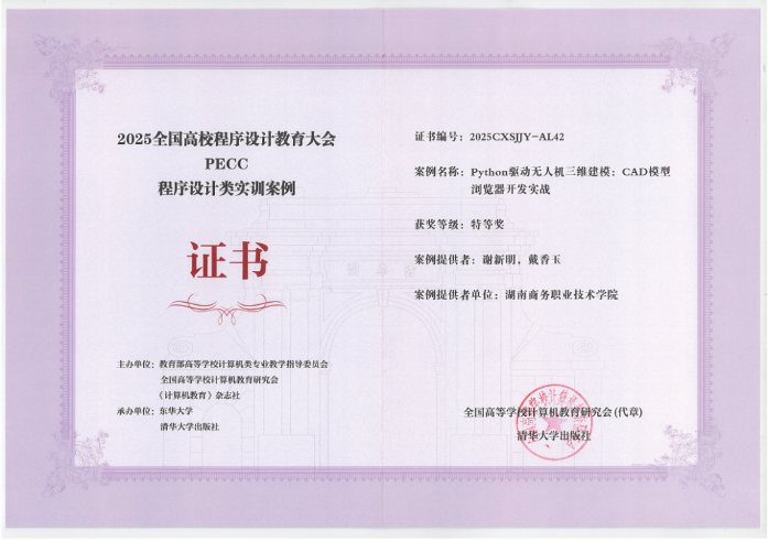 近日,由教育部高等学校计算机类专业教学指导委员会主办的2025年全国高校程序设计教育大会(PECC)在上海圆满落幕。这场汇聚全国高校计算机领域顶尖学者、教育专家与行业精英的盛会,成为前沿技术与创新教育模式的展示舞台。湖南商务职业技术学院商务信息技术学院专任教师谢新明团队脱颖而出,其提交的《Python驱动无人机三维建模:CAD模型浏览器开发实战》教学案例,斩获“程序设计类教学案例”特等奖。更引人注目的是,谢新明老师作为全场唯一高职院校代表,与清华大学、浙江大学等本科院校的专家们同台分享,用七年磨一剑的坚守,书写了职业教育与国产工业软件深度融合的传奇,充分展现了高职院校在程序设计教育领域的创新实力与卓越成果。