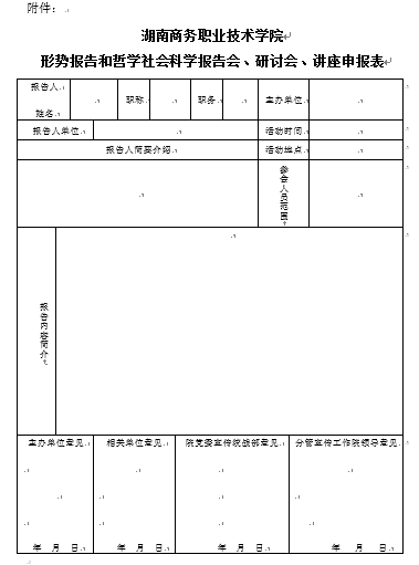 2.面向本部门或二级学院师生举办的报告会、研讨会、讲座、论坛,须经本部门或二级学院党政负责人审批同意,再报党委宣传统战部审批后方可举行。如属于湘商职院发【2012】7号文件规定的学术活动,需按该文件规定由科研产业处审批后,再报党委宣传统战部备案。