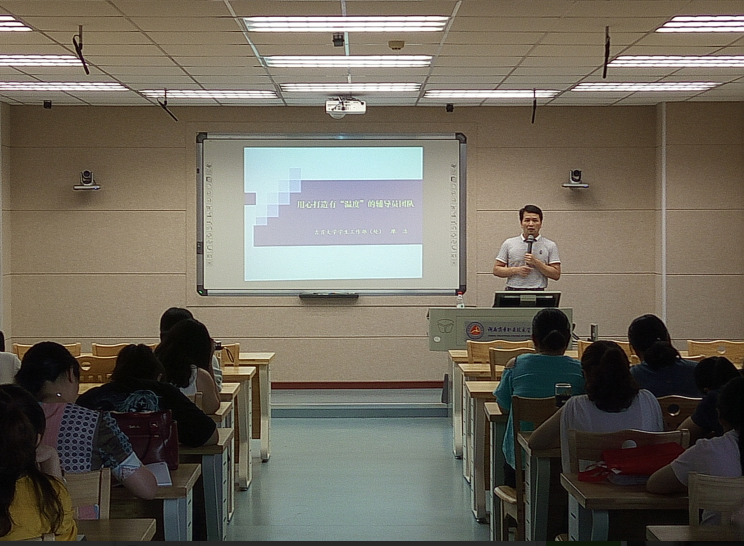 廖部长首先通过播放吉首大学元旦晚会中的辅导员节目视频,结合自己的学生工作经历向大家表达了辅导员的日常工作需要倾注情感,要以“幸福生活,快乐工作”为理念来开展工作。随后,廖部长向大家介绍了吉首大学辅导员队伍培训教育体系化、待遇保障制度化、考核评比常态化、环境氛围人文化的“四化”建设工作经验。最后,廖部长和在场的辅导员分享了自己之前在辅导员岗位上的个人感悟,指出在工作中要做一个温暖的辅导员,要不断地全面提升自我,只有做到有为才会有位。