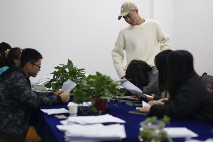 图为宿委会全体成员在进行“文明寝室”初选名单评选