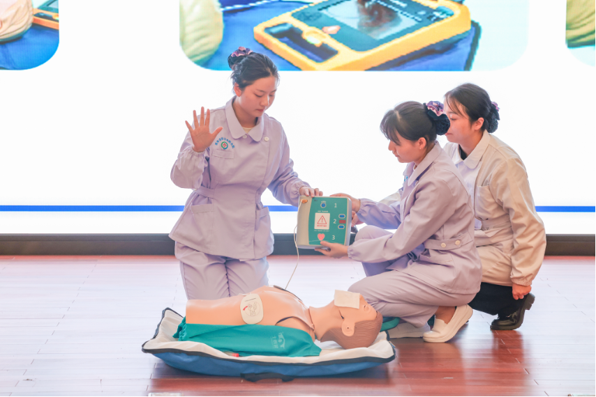 省职业病防治院职业健康部副主任医师余志林从职业病的概念,常见职业病发病条件、特点,以及如何预防职业病等,系统讲解了职业卫生基础知识。他的团队用“打快板”阐述CPR口诀与现场示范结合的方式展示了急救第一现场,引导同学们学会科学地进行抢救。