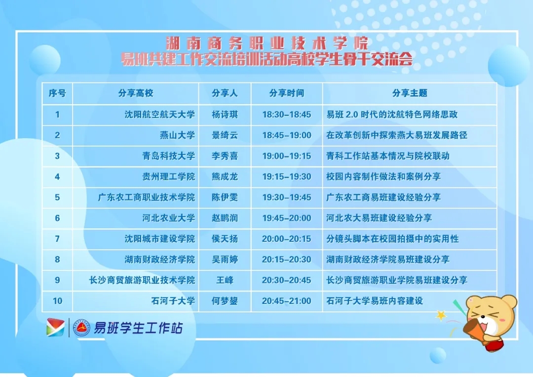 站讯(通讯员:李佳怡) 11月23日晚7时,我院发起全国十余所高校易班学生工作站骨干以线上的方式,共同交流各自高校易班建设经验、探讨学生易班建设工作,共同提升大学生网络思想政治建设能力。