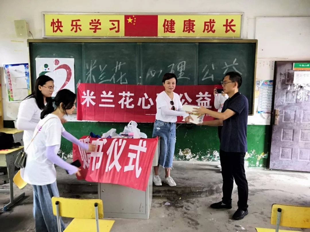 之后我们进行“赠书仪式”由“湖南商务职业技术学院米兰花心理健康教育中心”赠送给学校有助于培养小朋友积极健康向上心态的书籍,旨在培养小学生良好的心理素质,促进小学生身心全面和谐地发展和整体素质全面提高的教育。