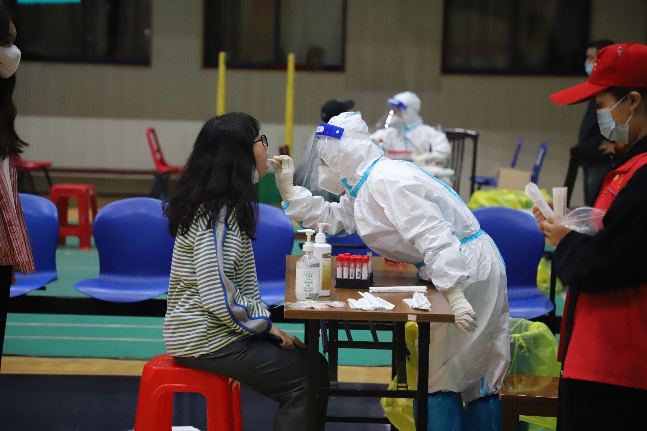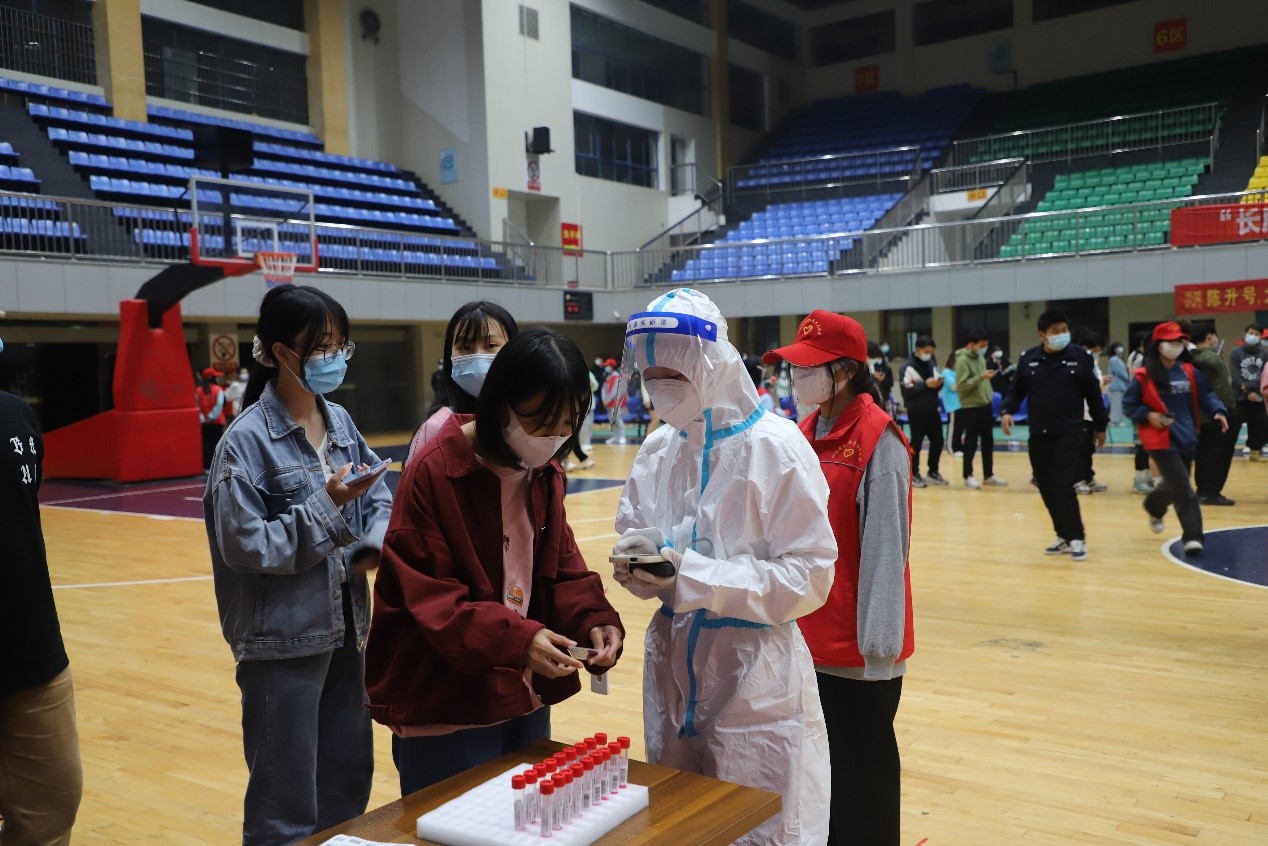现场人员繁多,白衣天使们耐心仔细地为同学们做核酸检测,志愿者和安保人员认真负责地管理现场秩序,同学们也积极配合工作人员,使得整个现场井然有序。