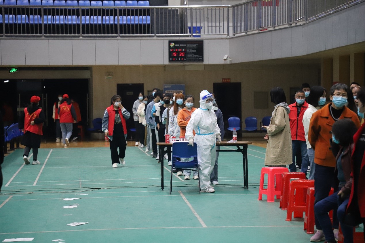 师生均佩戴口罩,在体育馆外有秩序的排队等候做核酸检测。体育馆内还播放着新冠肺炎的自我防护知识。