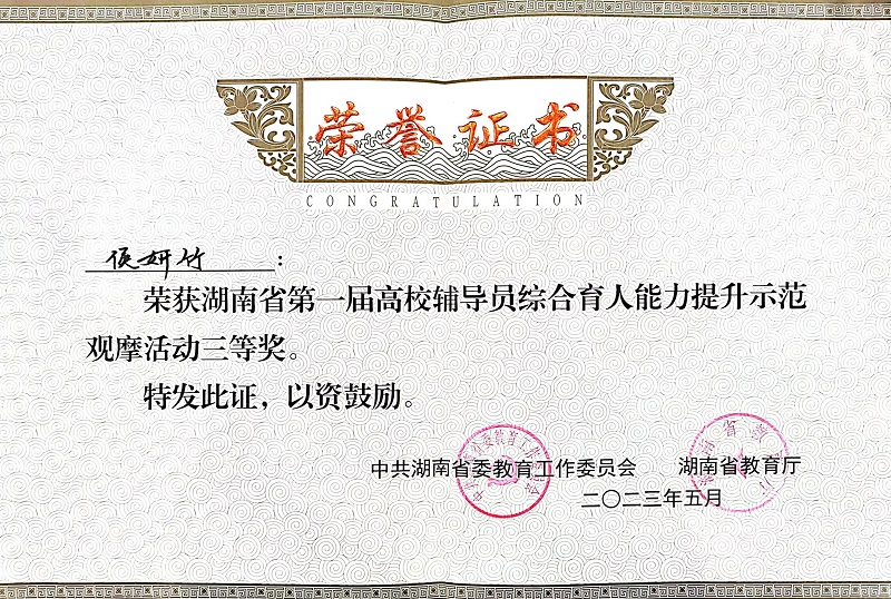 我院侯妍竹老师在湖南省高校辅导员综合育人能力提升示范观摩活动中获佳绩