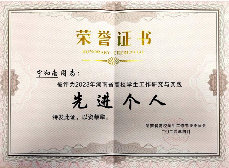 4月8日,由中共湖南省委教育工委、湖南省教育厅指导,湖南省高校辅导员工作专业委员会、学生工作专业委员会主办的2023年年会在吉首大学召开。我院被评为“2023年湖南省高校学生工作研究与实践先进单位”,辅导员夏瑞霞被评为“2023年湖南省高校辅导员工作研究与实践先进个人”、宁和南被评为“2023年湖南省高校学生工作研究与实践先进个人”。