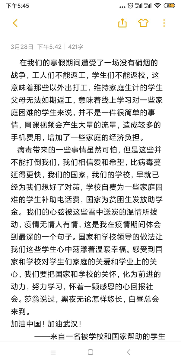 资助给学生带去的不仅是物质上的帮扶,更是精神上的鼓舞。19级茶艺与茶叶营销专业某同学在感谢信中说道:“当接到辅导员的通知,学校给予我们助学金和手机流量帮扶,我不禁鼻子一酸,已经无法用语言来形容我的心情了,只有感动在心头萦绕。非常时期,国家、政府和学校没有忘记我们这些贫困学子,让我有勇气战胜困难,感谢所有人!”17级会计专业的高同学更是先后两次捐款给疫情严重地区,还参加了村里的志愿服务队,她表示,“感谢学校的资助,对于自己在这次疫情中的捐款和志愿服务行为,我觉得自己作为党员和接受过国家、政府和学校帮助的学生,很想为社会尽一点微薄之力。”据不完全统计,在学校获得资助的贫困生中,有14人已经自愿加入疫情防控志愿者的队伍,用自己的青春和热血,回报社会,传递爱心。
