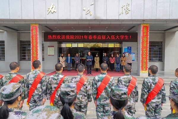 本网讯(通讯员 金芝蓉 潘友莉 汪翔)微风和煦,阳光正好,3月14日上午,我院2021年大学生参军入伍欢送会在办公楼举行,14名学子响应国家号召,光荣入伍,即将启程奔赴保家卫国的第一线。党委书记周忠新、副院长禹明华出席欢送会。