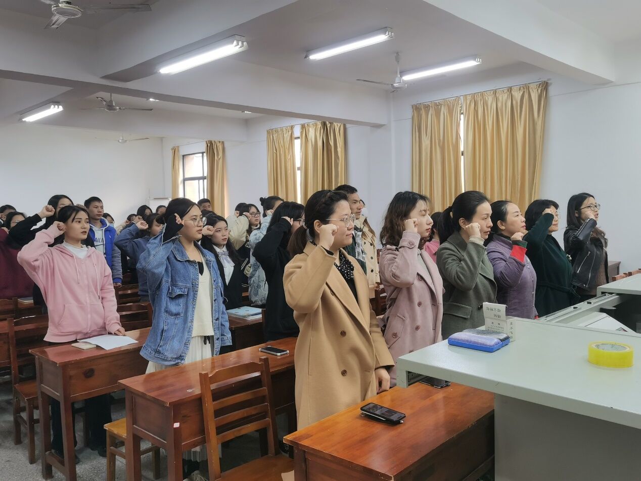 谭梦舟向大会报告参加会议的党员情况,在庄严的国歌声和入党誓词中,本次大会正式开始。
