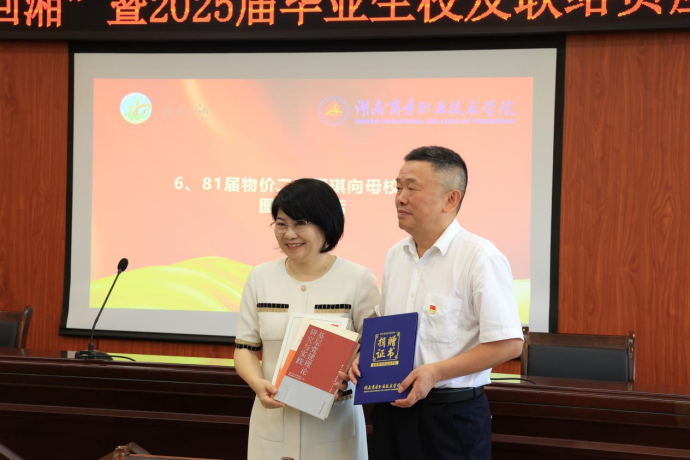 随后的分享环节,校友们的故事如时光画卷徐徐展开:岳阳校友会会长文选寄语学弟学妹大展宏图,为母校增光添彩;株洲校友会秘书长杨建新动情讲述从职场新人到行业骨干的蜕变之路;长沙校友会副会长陈煜博分享创业维艰中的破局智慧;81届棉检班苏光荣追忆恩师教诲同窗情,往事历历惹人怀。往昔的课堂点滴、社团趣事被一一唤醒,会场内掌声与欢笑交织。81届物价二班周琪校友更向母校捐赠其主编、获省级权威部门和专家高度肯定的党建书籍3种3册,为湖南基层党建服务指引,为全国献上湖南经验。