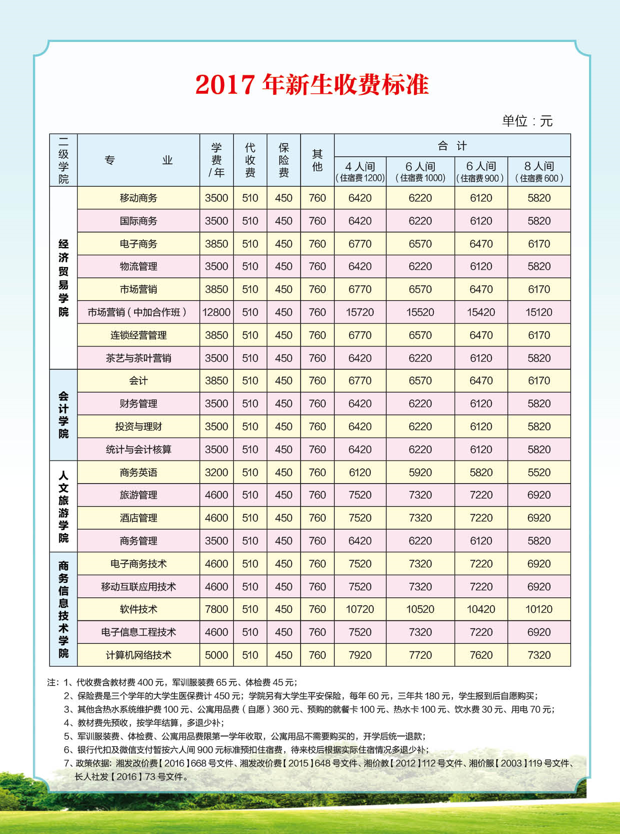 学院2018级新生收费标准